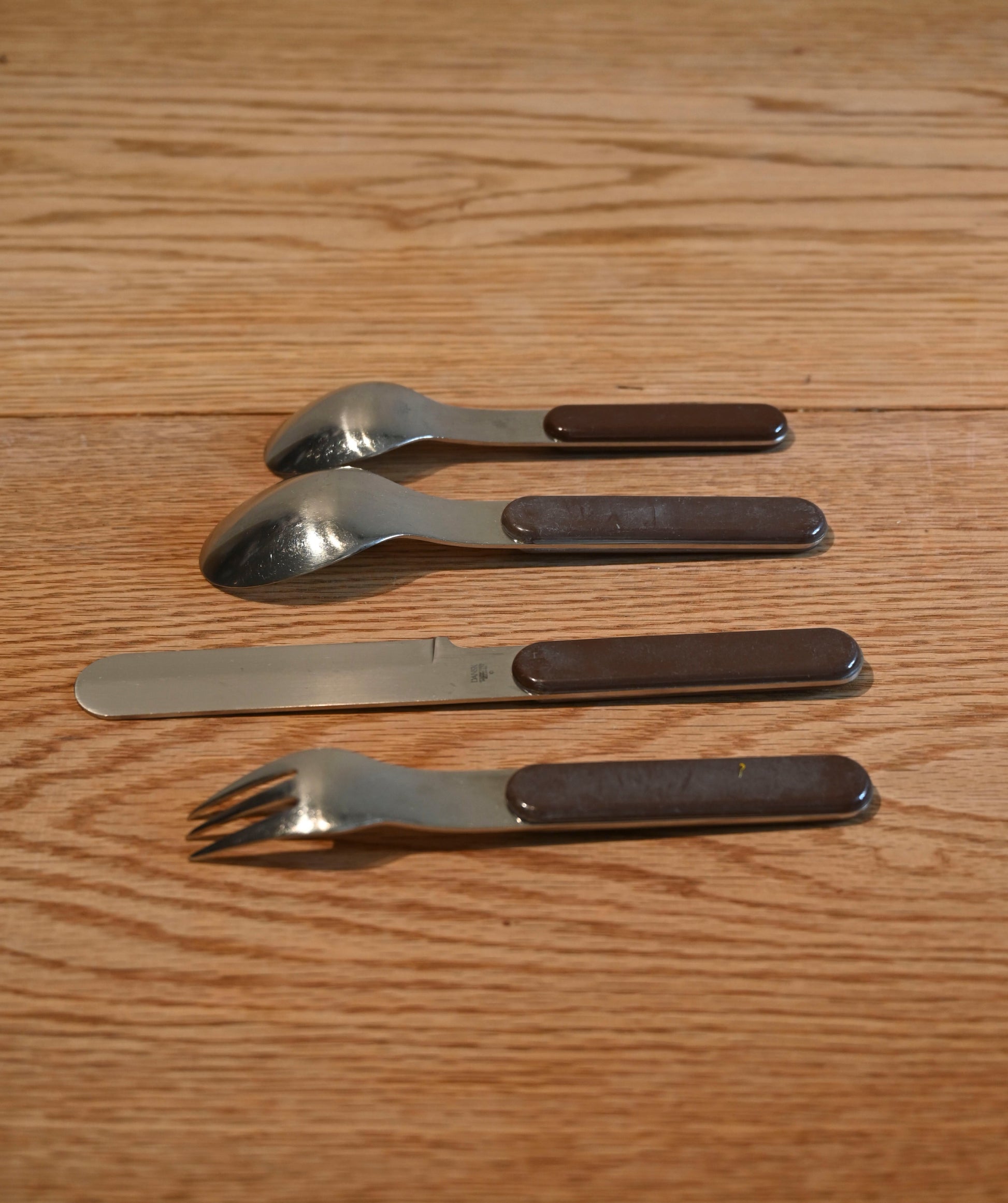 Vintage Dansk 4 piece cutlery set. Small fork, knife, spoon and dessert spoon. 12 sets available! Spoon - knife: 6.5"-7.5" length.