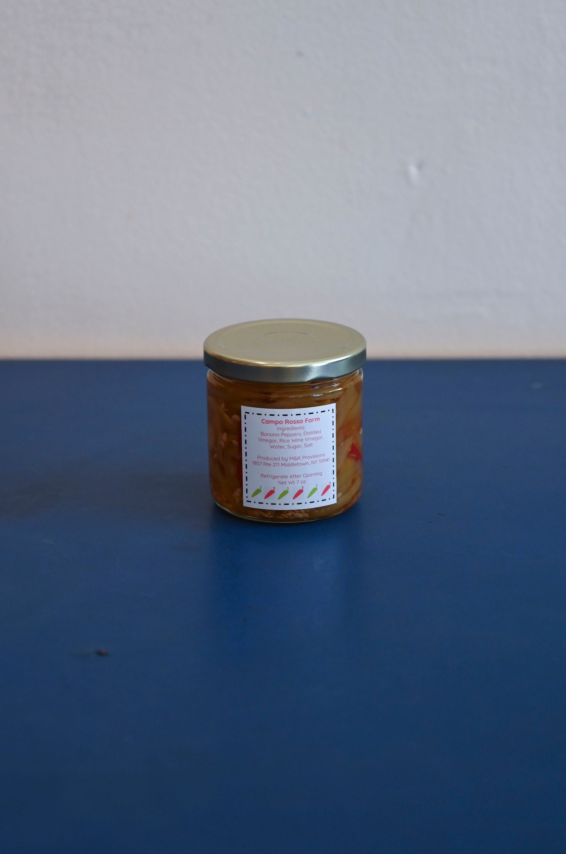 Ingredients: banana peppers, distilled vinegar, rice wine vinegar, sugar, salt. Peppers grown at Campo Rosso Farm produced by M&K Provisions in Middletown, NY. Refrigerate after opening.