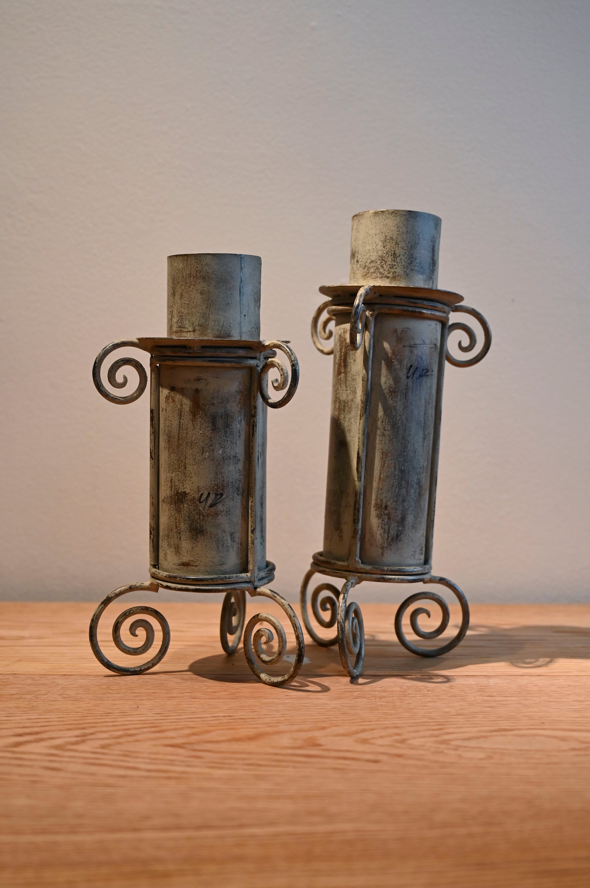 Vintage metal pillar candle holders set of 2. Dimensions: L: 14" h x 6" w x 2.5" x 2.5" d. S: 12" h x 6" w x 2.5" x 2.5" d.