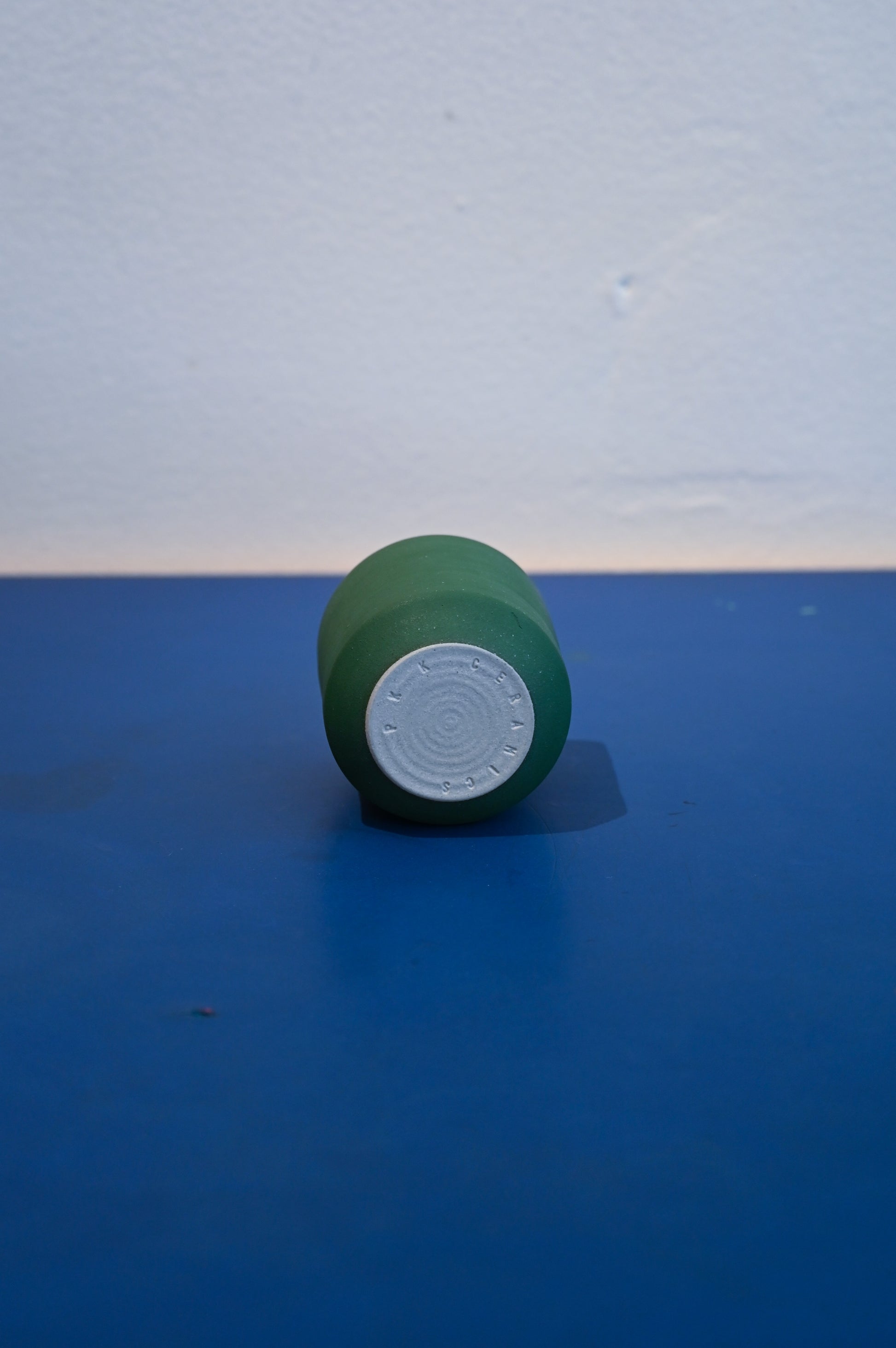 Hand thrown ceramics by Phill Kiho Kim. Off white interior with clear crackle glaze, matte green finish on the outside. Sanded smooth finish outside. Subtle color dots hand applied hidden throughout stoneware surface. 5 oz. H: 3" x 2.75".