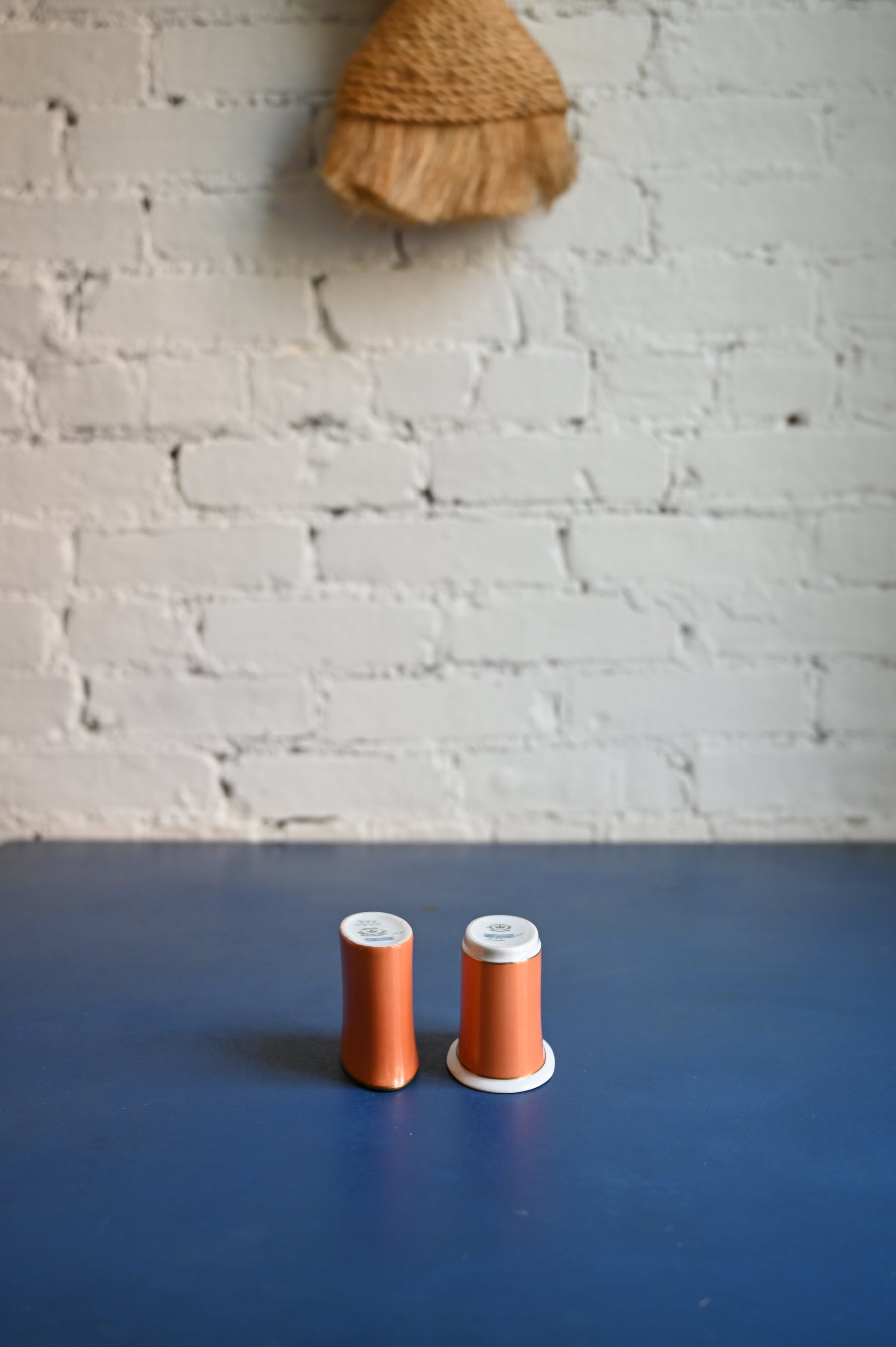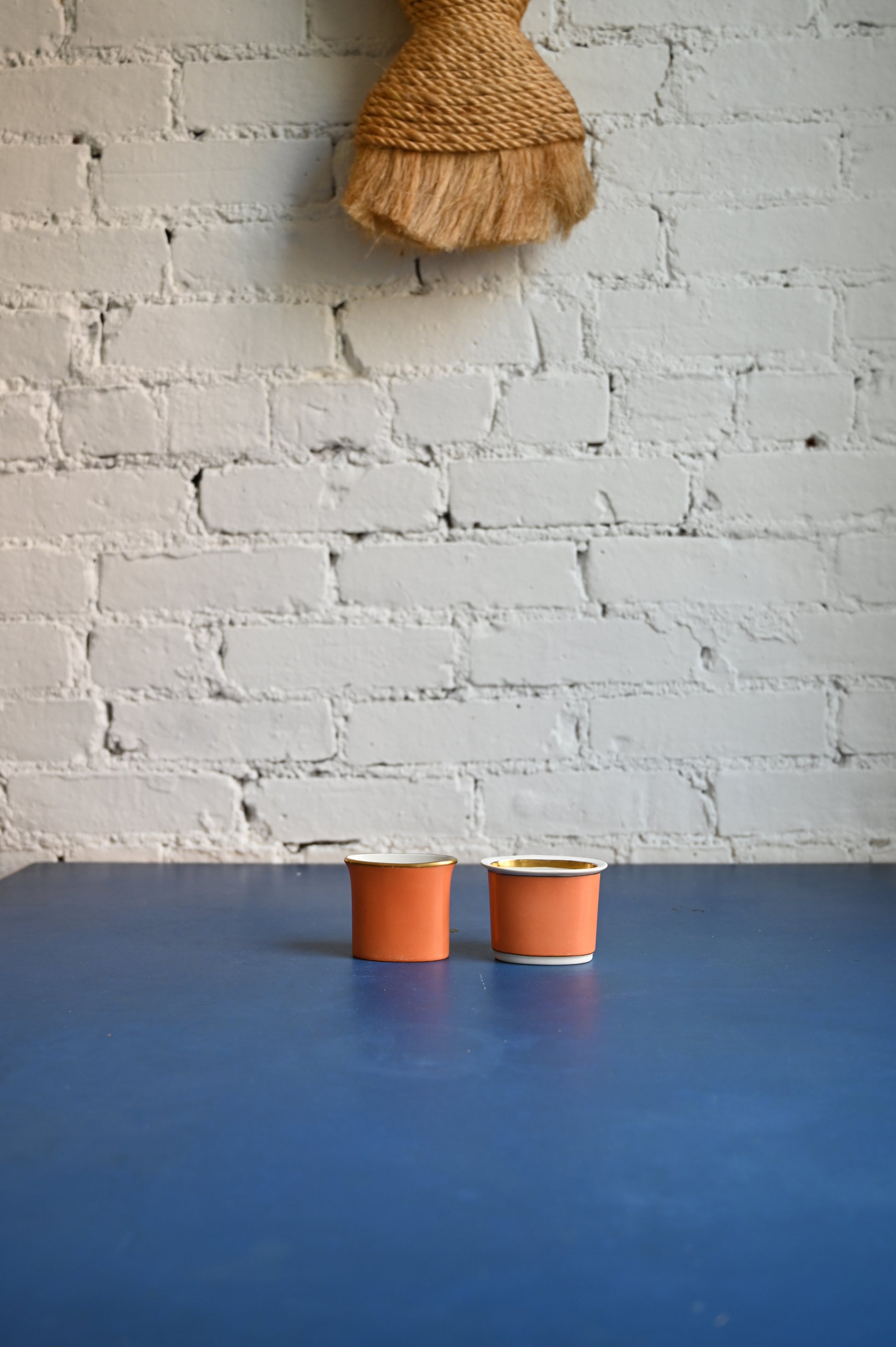 Royal Copenhagen Company orange cigarette holders. Orange with gold rim: 2.75" W, 2.5" H, 1.4" D (opening). Orange with white rim: 3" W, 2.25" H, 2" D (opening).