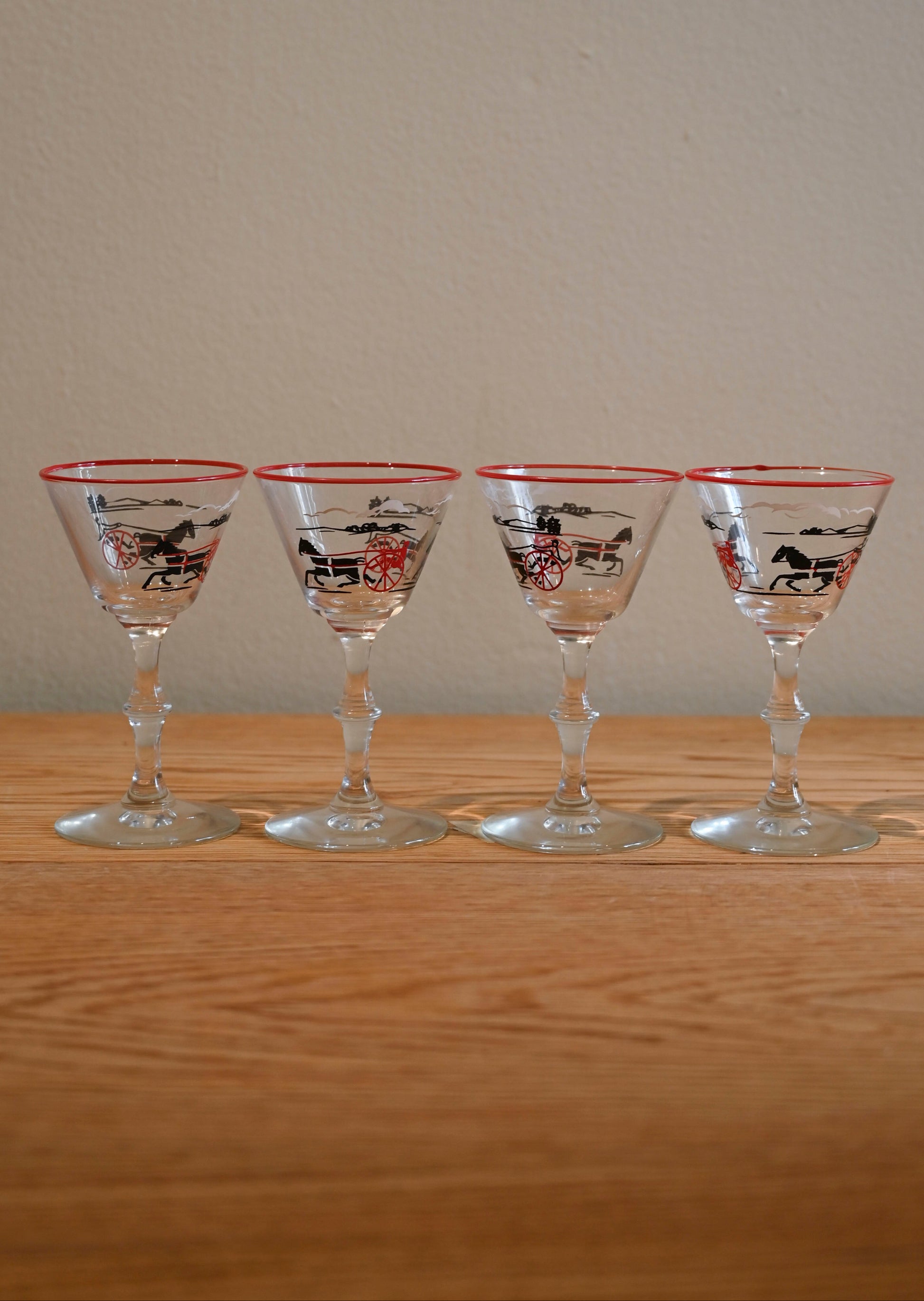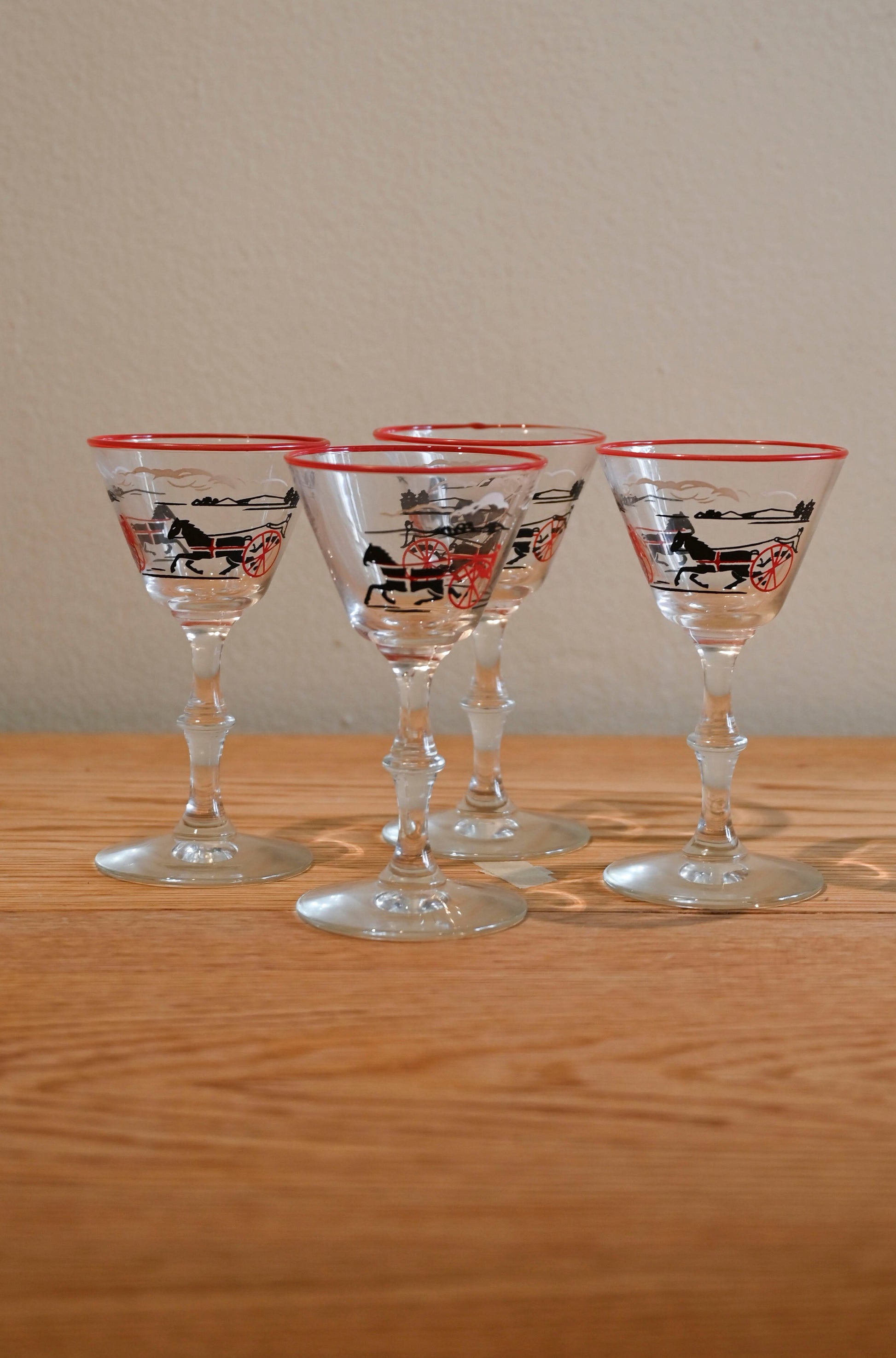 Cowboy decorated martini glasses. Set of 4. Not dishwasher safe. Each: 5" h, 3" d.