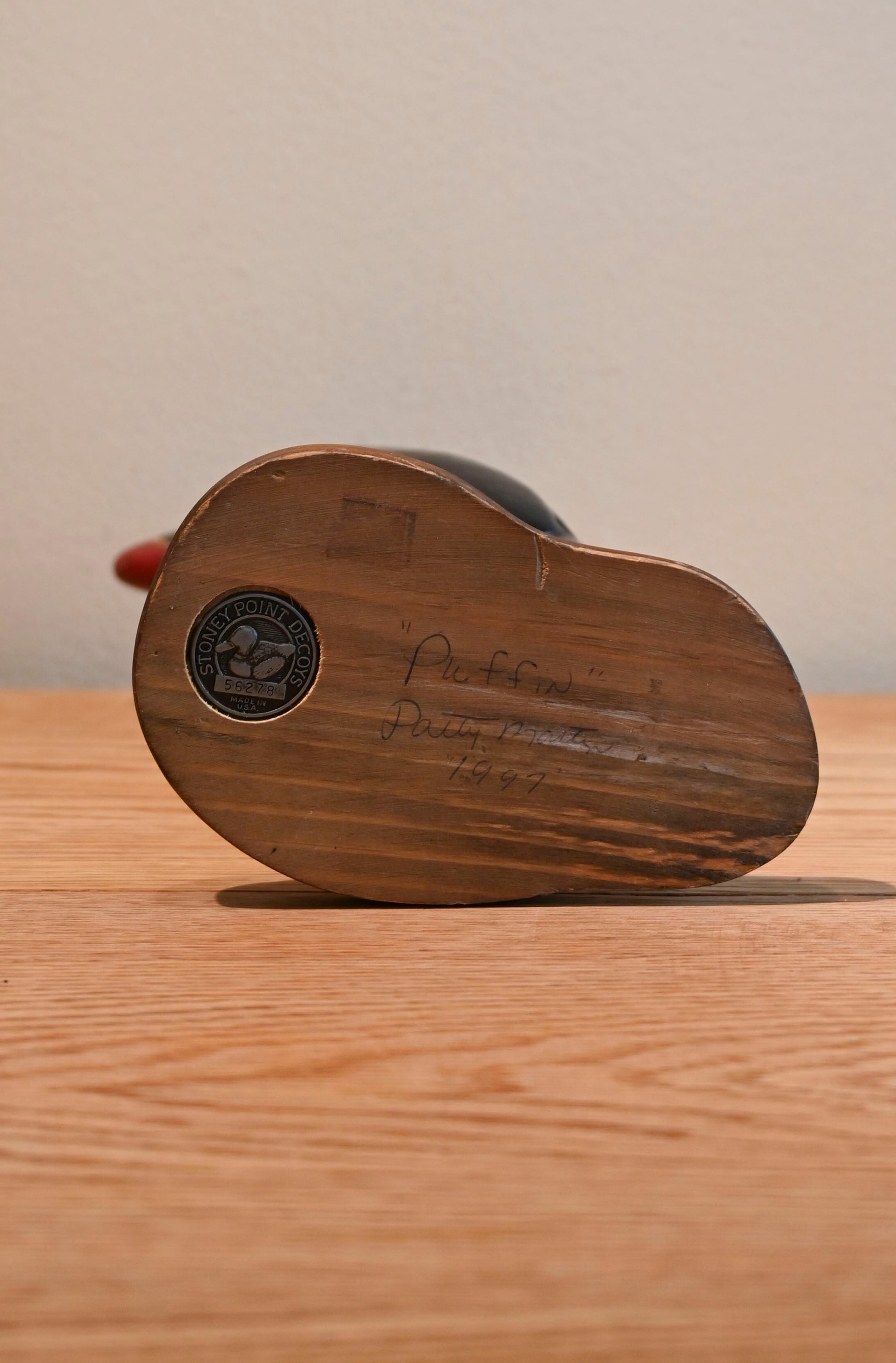 Vintage wood cared and painted puffin sculpture on stand. Signed verso. Dimensions: 12"h, 7" w base.